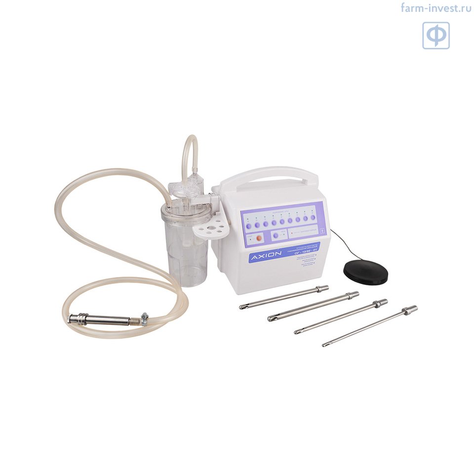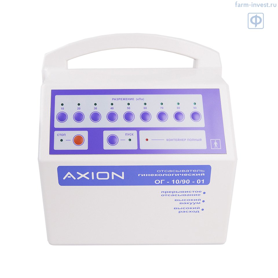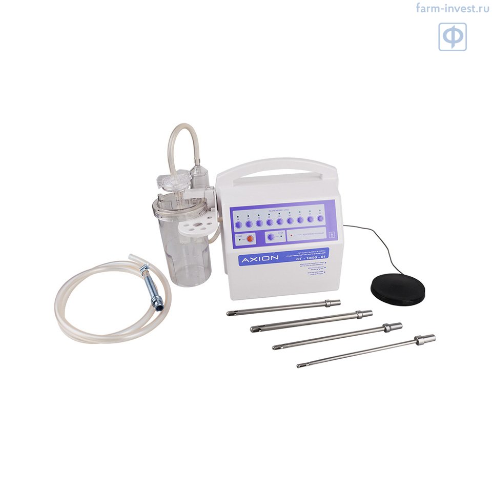 Отсасыватель гинекологический вакуум-аспирационный ОГ-10/90-01 АКСИОН мембранного типа предназначен для проведения операций по прерыванию беременности методом вакуум-аспирации, опорожнения матки после родов, а также для взятия аспирата при полном индивидуальном осмотре и лабораторном исследовании.