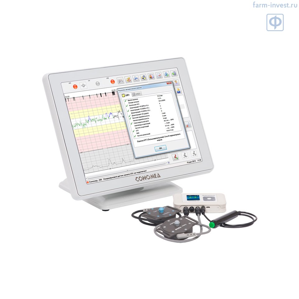 Телеметрический фетальный монитор с автоматическим анализом КТГ (кардиотокограф) Сономед-250 предназначен для исследования состояния плода, регистрации его сердечного ритма и двигательной активности, а также фиксирования сокращения матки в различные периоды беременности и во время родов.
