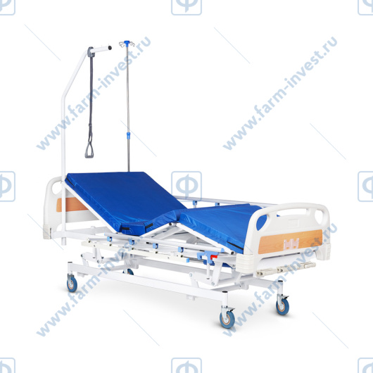 Кровать медицинская Армед РС106-Б механическая с четырехсекционным ложе имеет функцию регулировки положения спинной и ножной секций, а также корректировки высоты ложа, комплектуется инфузионной стойкой и опорой для подтягивания.