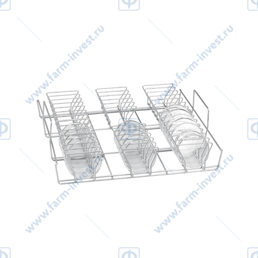 Поставляется в расширенной комплектации для лаборатории: верхняя корзина, различные вставки для стаканов, чашек Петри, пробирок, колб и цилиндров, модули для виал, лабораторной посуды большого объема, верхняя крышка для машинки, инжекторные сопла для колб и мерных цилиндров, опорные решетки для модулей, сетчатая крышка.